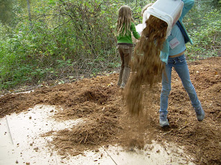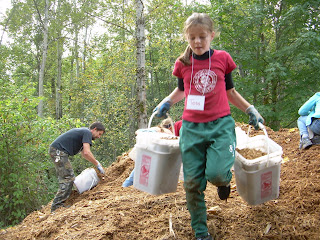 We wrapped up lunch and thanked the band, our group tracked back down to the 14th and Holly site where we picked up sheet mulching. These ever so young and energetic people sheet mulched 550 sq.ft. in 30 minutes. The kids were finding alternate ways to fill buckets, starting mulch buisnesses, writing songs about mulch, keeping communication very open and organizing themselves to have some people for running buckets back and forth dumping, some for filling, a few on cardboard, and some for distributing the empty buckets.